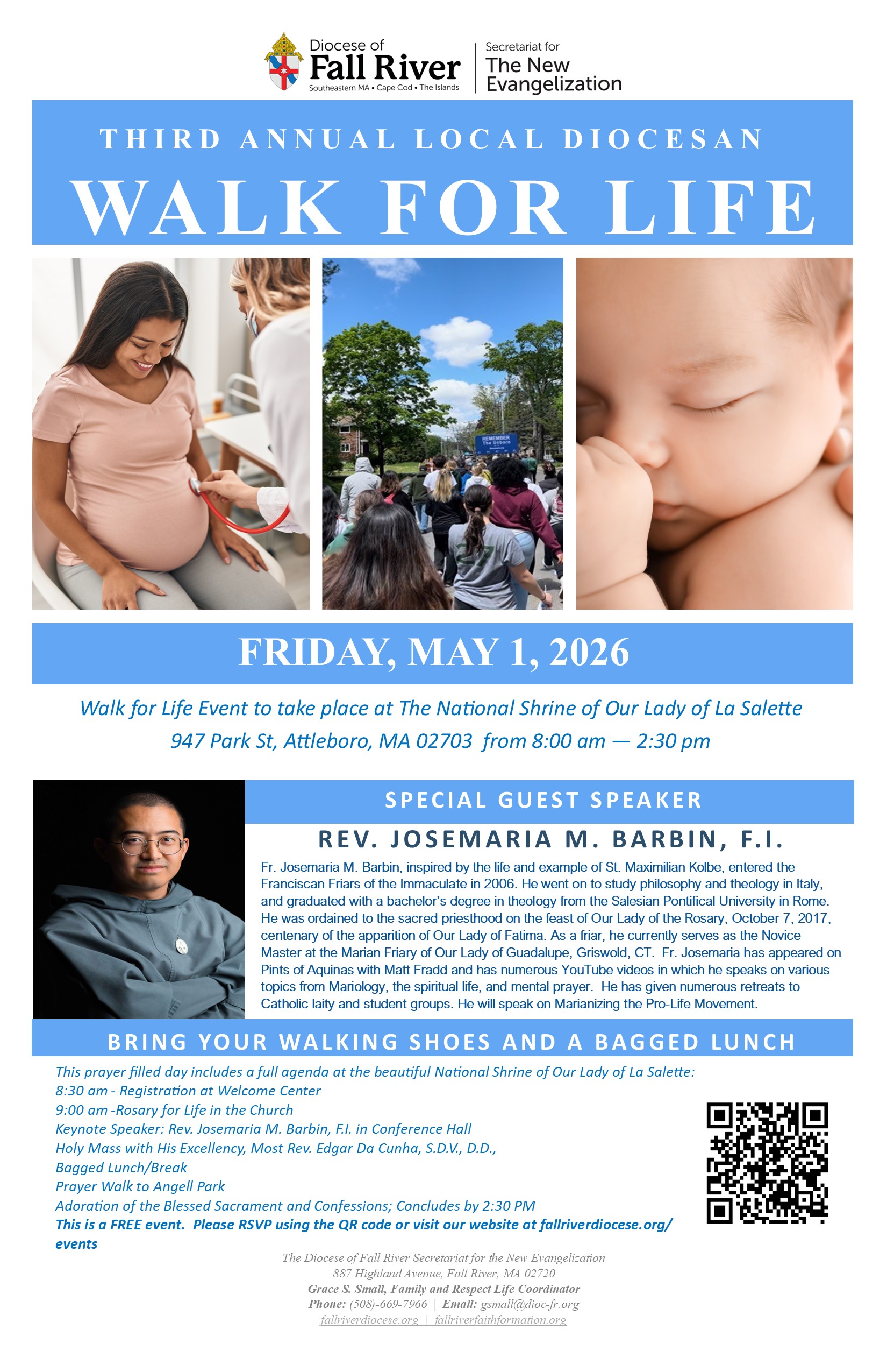 Bring your walking shoes and a bagged lunch to the third annual local Diocesan Walk for Life. The program will feature special guest speaker Franciscan Friar of the Immaculate Father Josemaria M. Barbin. This will be a prayer-filled day with a full agenda: