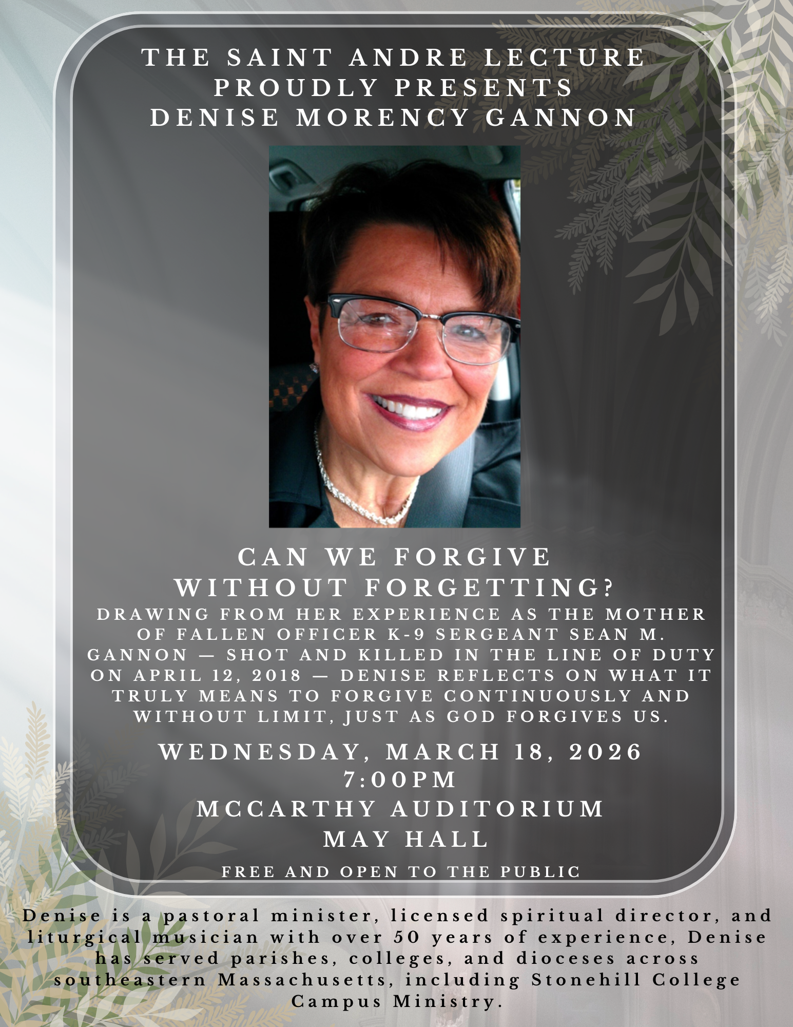 This year’s lecture, “Can We Forgive Without Forgetting?”, will be offered by Denise Morency Gannon, who will reflect on forgiveness through her experience as the mother of Fallen Officer K‑9 Sergeant Sean M. Gannon. Drawing on faith, profound loss, and perseverance, Denise invites us to consider what it means to forgive continuously and without limit, just as God forgives us.