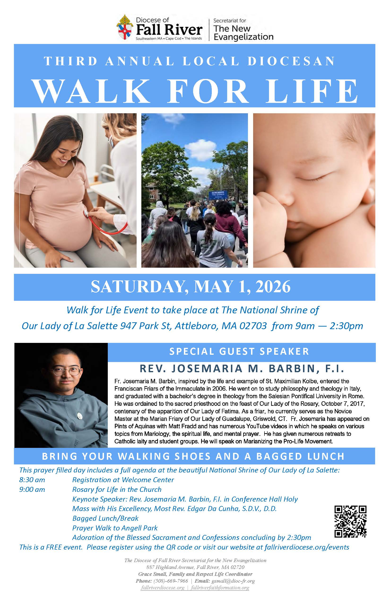Bring your walking shoes and a bagged lunch to the third annual local Diocesan Walk for Life. The program will feature special guest speaker Franciscan Friar of the Immaculate Father Josemaria M. Barbin. This will be a prayer-filled day with a full agenda: